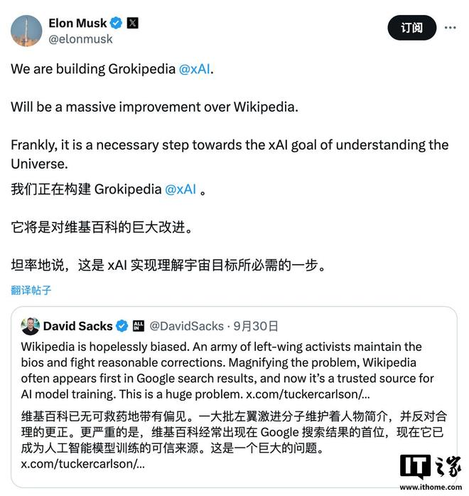 这是10月1日新闻的家中,马斯克昨晚通过自己的X平台公开表达了他对Wikipedia的不愉快性,并宣布它将推出“新的百科全书 - 培养的AI”。马斯克说,该产品将开发XAI,并声称准确性和中立性将超过Wikipedia。同时,该项目与更大的“理解宇宙”的愿景紧密相关。马斯克对投资者戴维·萨克斯(David Sachs)在X上的上述声明做出了回应。“我们正在XAI上建立Grokipedia,这将比Wikipedia更好。坦率地说,这是实现Xai了解宇宙的目的的必要步骤。”马斯克计划打开Grokipedia资源的结果,但没有披露该项目的具体细节,例如发布时间,技术体系结构以及如何防止AI本身的偏见。因此,马斯克几周前在这个方向上指出了SA House。他曾经说过Xai Chatbot Grok可以“重新写WikiPedia“通过删除错误消息并使用合成数据来纠正它们,而Grokipedia是该想法的扩展。