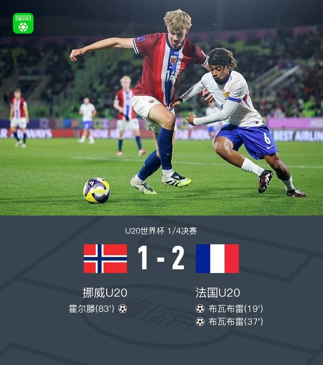 北京时间10月13日,U20世界杯四分之一决赛,挪威U20对阵法国U20。挪威U20霍尔滕进球。法国U20布瓦布雷已经梅开二度。最终比分是挪威U20 1-2 法国U20。主赛事第19分钟,钱伯助攻,布瓦布雷第二脚破门,法国1-0挪威。第37分钟,勒博涅助攻,布瓦布雷抽射破门完成双击,法国2-0挪威。第83分钟,格拉纳斯左路传中,霍尔滕头球破门扳回一分,挪威1-2法国。 12分钟,贝尔蒙特左路突破底线,小角度射门被门将挡出。第15分钟,格拉纳斯禁区内射门,皮球没能进球。第19分钟,钱伯助攻。进攻中,布瓦布尔第二球打进,法国1-0挪威。第37分钟,勒博涅助攻,布瓦斯布雷抽射破门,完成双射。法国2-0挪威。在第622分钟,腿脚出界,进球无效。第70分钟,维斯特德冲撞,主裁判向他出示黄牌。 83分钟,格拉纳斯左路传中,霍尔滕头球破门扳回一分。挪威1-2法国。 90分钟,塞特布推倒恩津古拉身后,裁判向他出示黄牌。球队阵容技术统计