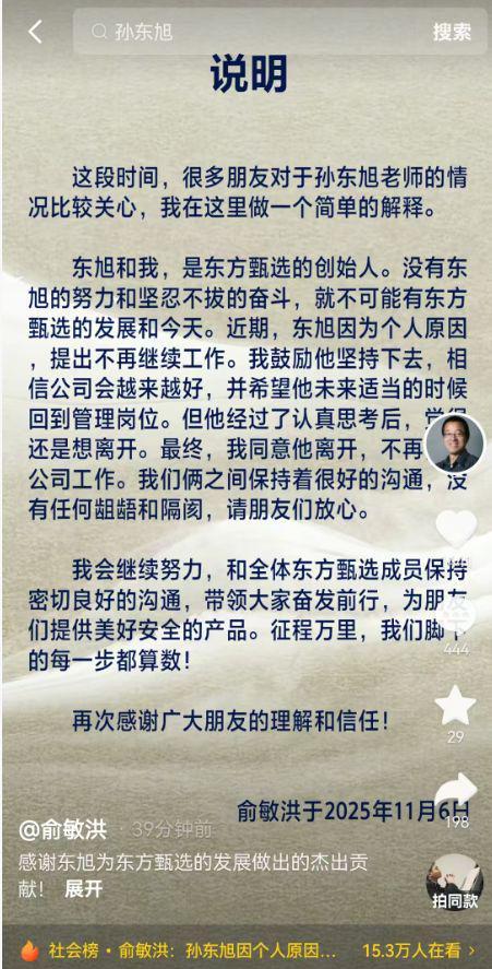 11月6日,俞敏洪在抖音账号发布声明:此时,很多朋友都比较关心孙东旭老师的情况。我在这里做一个简单的解释。我和东旭是东方精选的创始人。没有东旭的努力和坚持,就不可能有东旭精选的发展和今天。近日,东旭因个人原因提出不再继续工作。我鼓励他坚持下去,相信公司会越来越好,也希望他以后在适当的时候重新回到管理岗位。但深思熟虑后,他还是想离开。最终,我同意他应该离开,不再在公司工作。我们两个人保持着良好的沟通。文友之间若有任何争执回避,敬请谅解。我将继续努力,与东方精选全体成员保持密切、高效的沟通,带领大家砥砺前行,为广大朋友提供优质、安全的产品。俞敏洪发文确认孙东旭辞去东方选举职务。图片来源:俞敏洪抖音账号。 2023年12月16日,“小作文”事件发生后,东方精选发布公告称,东方精选董事会决定,董事长俞敏洪兼任东方精选首席执行官,孙东旭解除东方精选执行董事兼首席执行官职务,立即生效。 2025年8月22日,东方精选发布声明称,孙东旭老师正在休假,并未辞职。自2023年12月起,孙东旭先生担任东方、俞敏洪先生选拔顾问。俞敏洪老师和孙东旭老师一直保持着良好的沟通。 2023年12月起,孙东旭担任东方评选顾问还有俞敏洪。图片来源:直播东方精选室。据封面新闻报道,孙东旭2007年本科毕业后加入新东方集团,先后担任天津新东方学校涉外考试部教师、合肥新东方学校校长助理、西安新东方学校校长。 2019年,年仅34岁的孙东旭出任新东方在线CEO。 2023年3月,新东方在线更名为东方精选。在2023年的会议上,孙东旭因“小论文争议”而受到关注。当时,他因对董宇辉文案创作权属纠纷处理不当,被免去东方精选执行董事兼首席执行官职务。此后,孙东旭就没有放弃新东方体系。 2024年11月24日,亮相东方精选直播间。天尼号查核显示,孙东旭姓名关联公司共8家,其中尚存7家,包括东方精选(北京)科技有限公司、东方精选(北京)科技有限公司。孙东旭在上述公司担任执行董事、经理等职务;其担任的法定代表人和实际控制人的合肥新轩教育咨询有限公司已被注销。孙东旭一共在8家公司任职。截至11月6日发稿,东方期权(HK1797)报21.54港元,涨幅0.84%,市值226.99亿港元。图为东方股份股价、每日经济新闻、俞敏洪抖音账号及公开信息