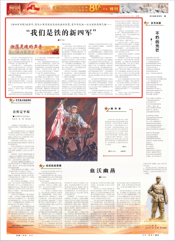 在“新的第四军军事歌曲”的旋律中,长江的风格和黄河流向东方,而中国民族的英勇精神向前迈进 - “我们是铁头新的第四军”■张Xijian,作为士兵,作为一名士兵,总是感觉到每次唱“新军”的奇妙力量。是长江的宏伟风格和黄河流入东方,而中国国家的英勇精神则可以前进。 1979年冬季中旬,一辆长途巴士装满了200名新兵,赶往军事营地。当车队将陡峭的山顶驶向蜿蜒的山路时,第一辆车上的女军医生突然站起来,指着山区的一个村庄,说:“看,纳卡尔(New Army)在纳卡尔(Nakar)的新任纳卡尔(Nakar)的总部”,她说,这位女军事医生转过身来,将她的头转向了她的头,并向新的伴侣举起了新的伴侣,现在我们将获得新的伴侣,我们将获得新的伴侣,“我们将获得新的伴侣,“我们将以自我的方式进行了“我们的手”。n演唱“四军的新歌”。找出这首军事歌曲,并记住您是来自“铁军”镇的士兵! ”“在瓦昌市的光荣攻击,我们的名字很肮脏...向东走!向东!我们是铁的新第四军! “那个下午,当烈日闪耀时,热情的旋律击中了年轻士兵的心,并将英雄的基因种在所有人的血液中。我就是这些热情的新兵。我们一直唱着“新的四军军事歌曲”,并进入了一场捍卫沿海河的政权,后来捍卫了沿海的沿海沿岸。 1980年代初期,我第一次去了Yunling,并在199春季的春季音乐节期间,我第一次去了Yunling。1,我很高兴听到烈士的烈士公墓在安海南部完成。但是当我来到尤恩林时,那是雪,墓地没有打开。我发现该镇的武装部门是为了尝试一下,恰好是值班官员的妻子,后者是公墓中民兵的评论员。那天,一位民兵评论员赶到雪地,在南部南部南部事件的15公顷烈士公墓,给了我一个认真的解释。不幸的是,我未能进入南部南部事件的展览大厅,守护着许多文化文物。在主要纪念碑的前面,我唱了一首歌“新的第四次军队歌”。那一刻,冷空气的抱怨就像我唱歌的伴奏。在2006年的标签和联盟政治委员会的后期,我带领一支在南部山区山区的团队进行训练。在旅途中,我在山上建立了一个露营地在吉格克斯县附近。此时,我按照自己的意愿进入了南部的Anhui事件大厅。聆听导游的叙述,我的思想在战争年代浮现。 1939年2月,春天很年轻,尤恩林陈家族大厅的气氛很热。在新的第四陆军部门举行的夜间聚会上,维卡尔·席莱(Zhou Ellai)调查了南海南部(Anhui),战斗歌曲互相高潮。第一支队的指挥官陈·耶(Chen Yi)用法语唱了一首马赛歌曲:“通行证,进步……我们正在等待重要的自由并决心与之抗争……”面对无尽的掌声,Chen Yi情绪激动:如果我们有一首新的陆军战争歌曲,那就太好了。周·恩莱(Zhou Enlai)点头表示:好吧!你是诗人,只写歌词!回到江苏南部后,陈伊在战争期间迅速想到了这个想法,并创建了“十年 - 戈德”诗分为三部分,总共35升三月底的Ines。这首诗源自与“铁军”精神作战的新的第四军10年的进程,传达了Red4th Army的光荣传统,并在南部的三年游击战中吓坏了强大的战斗精神,涵盖了政治信仰,战斗政策,军事社会关系和新的第四军风格。随后,新的第四军组织组织工作人员进行集体讨论和变化,形成歌词分为两个部分和320个单词,以及He Shide创作的音乐,He Shide是新的第四军的文化群体,教授军团。一首雄伟而高度激烈的战争歌曲从这里诞生。尽管已经过去了几十年,但历史上旅行的经典似乎在您面前。在展览厅的旋律声音中,歌词发芽到我眼前的血腥图片中 - 我似乎看到了Ye独立团希娜(Hina)在北部探险中建立了伟大的军事成就,他是新第四军“铁军”声誉的来源。看来我看到了金山红旗滚动,摧毁了“敌人的围攻”,并使用“党指挥枪”来培养新第四军的永恒军事精神。我似乎看到南部红军的游击队在公开赛中睡觉,与血腥的战斗作战,忘记了新第四军的“骨头”。看来,我看到,在与日本的艰难战争年中,英雄们继续互相流血和牺牲,并实现了永恒的目标……在继续“新的第四军军事歌曲”的旋律之后,我还访问了武汉,北昌和Yancheng和Yancheng,并参观了革命革命Baseslad of Jingghanan and Moshan和Moshhan。我认为,这个地方的名字或山名在中国革命历史上闪耀的名字长期以来一直是“铁军”战争世界上刻有生动的脚注。在Yunling New Village团队文化团队新礼堂的约会地点,我读了一个历史上的鲜为人知的现实。 1939年7月1日中午,第四军的新部门选择安排军事歌曲,试图在中国共产党成立18周年练习唱歌。当这首歌在山谷中大喊大叫时,新第四军政治部局长Yuan Guoping代表军事部门宣布,这首普通歌曲正式被称为“新的第四军之歌”。目前,有十二架日本飞机突然出现在天空中,一只疯狂的格赛灭绝炸弹,村庄,山脉和森林突然落入了火海中。军队负责人当然命令指挥官和战士立即向大火释放和拯救人民。在江苏的长州,我听到新第四军的女士兵沉鲁兰人讲述了一个关于战斗经历的故事。 1943年11月的一个晚上,沉·鲁兰(Shen Ruolan)跟随导师否认他的智慧。在越过封锁线时,讲师被枪杀并受伤,一旦他完成谈论联合地点,他就死了。在沉鲁兰(Shen Ruolan)到达联合地点后,他使用了“新四军军事歌曲”的一段来获得地下政党的信任,并及时完成了工作。在北部福建的Chishi镇,我听了一首英雄纯净的实施歌曲,该歌曲在1983年的Anhui事件期间,宣传团队成员Ren Guang死了,他的妻子Xu Ren,新的第四军的政治部门Xu Ren受到了严重伤害并被俘虏。在上香